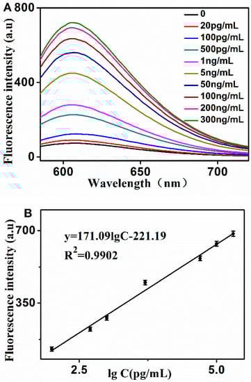 The fluorescence spectra were obtained with a Hitachi F-4600 spectrophotometer (Hitachi Co. Ltd., Tokyo, Japan, www.hitachi.co.jp) equipped with a xenon lamp excitation source at room temperature. The excitation was set at 518 nm, and the emission spectra ranged from 580–750 nm. The slits of the excitation and emission were set at 5 nm. The control experiments had the same measurement process, except without the addition of PSA. At the same time, each experiment was repeated 3 times, and the relative standard deviations were plotted as the error bar. In addition, three different potential interference compounds, CD63, BSA, and D-dimer, with a concentration of 50 ng/mL, were added with the absence, as well as presence, of 5 ng/mL PSA, to investigate the selectivity and specificity of the established assay. The value of the fluorescence intensity was used for quantitative assay of PSA. F1 and F0 is the fluorescence values at 606 nm in the presence and absence of PSA, respectively.