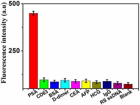 Fluorescence response of the assay in the presence of PSA (5 ng·mL−1), CD63 (50 ng·mL−1), BSA (50 ng·mL−1), D-dimer (50 ng·mL−1), CEA (5 ng·mL−1), AFP (50 ng·mL−1), HCG (50 ng·mL−1), IgG (50 ng·mL−1), RS ssDNA (5 nmol·mL−1), and blank control, respectively.