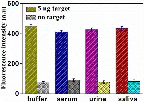 In order to evaluate the performance of this bioassay for the detection of PSA in practical samples, two different concentrations of PSA were added into blank biological samples, including human serum, urine, and saliva. All spiked samples were diluted to 10%. As shown in Figure 6, a distinct enhancement of the fluorescence intensity was observed in various biological samples in the presence of 5 ng/mL PSA, compared with blank biological samples. Meanwhile, the difference of the signal between the buffer and diluted human fluid was within 20%. The results of 0.5 ng/mL PSA are shown in Figure S4. These results indicate that the proposed assay was feasible for analyzing PSA in biological samples.