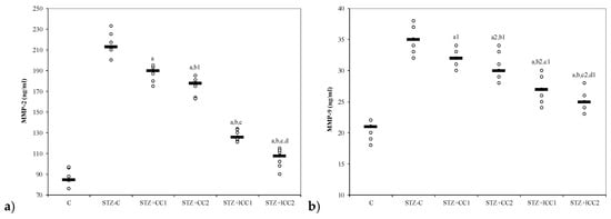 | MMP-2 (ng/mL) | 86.00 (8.47) | 215.71 (10.70) | 187.86 (7.76) | 174.86 (8.36) | 127.29 (5.09) | 105.29 (9.05) |