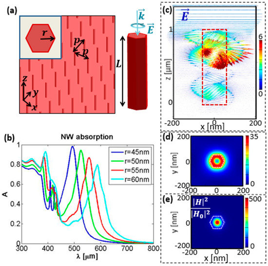 Structures under investigation are hexagonal Si NWs, that can be patterned on Si substrate, e.g., by means of conventional electron beam lithography [32,33]. In what follows, we use a commercial-grade simulator based on the 3D Finite Difference Time Domain (FDTD) method by Lumerical [34] to simulate complex electromagnetic fields in the Si NW array, and later extract C factor; more details are given in Section 4. The scheme of the simulated device is given in Figure 1a: vertical hexagonal NWs of radius r and length L are periodically arranged with periodicity p in x and y direction. Such structures have been previously proposed for absorption enhancement, lasing and solar cells, as they can efficiently absorb the visible spectrum wavelengths. The structure is excited by a circularly polarized plane-wave under normal incidence. In Figure 1b we show the absorption spectra dependence on the NW radius, for L = 1000 nm, and p = 400 nm. As expected from theory [35], as well as experiments in [30,31], there is always a fundamental HE11 mode excited for these thin NWs, which leads to the resonant absorption; moreover, with the radius increase, the resonant wavelength of the mode red-shifts. For this periodicity, the mode closely resembles the leaky waveguide mode of the single Si NW. In Figure 1c, the electric field vector in xz cross-section of the unit cell is shown for the NW array with parameters r = 50 nm, L = 1000 nm, p = 400 nm, excited at its resonance λ = 525 nm with CP light. Clearly, the electric field keeps circularly polarized behavior, while it experiences enhancement, especially in two regions of the volume corresponding to the antinodes of the Fabry–Perot resonances (due to the boundary conditions at the top and the bottom of the NW). In Figure 1d, we show the electric field intensity enhancement at z = 800 nm xy cross-section of the unit cell; there is an obvious leakage of the mode to the surrounding medium, along with a 35-fold increase. In Figure 1e, for the same cross-section, the magnetic field enhancement is even higher, but it remains confined in the NW core. According to Equation (1), the enhanced C can be expected at the points where these field enhancements spatially overlap, while and have parallel components out of phase. In the close vicinity of the NW, molecules present in the surrounding medium will experience both electric and magnetic field enhancement, while for the near-field chirality calculations, their phase difference must be considered as well. Thus, in the following, we investigate C distribution dependence on the NW parameters at the resonant wavelengths; we report on the normalized C* = C/C0, where C0 is extracted for the RCP excitation of the simulation domain without the Si NWs. For better visualization, we show only the points with |C*| > 1.2.