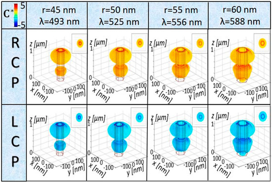 Firstly, C distribution in the unit cell is investigated for p = 400 nm and L = 1000 nm, for the radii investigated previously. In Figure 2, in all the cases, |C*| is higher than 5 at the NW borders and remains enhanced in the NW proximity, where the chiral molecules can be deposited for the experiment. More importantly, for RCP (LCP) excitation, C* keeps the positive (negative) sign of the excitation (normalization by RCP), while having increased values. As the whole domain is achiral, the resonant wavelengths for RCP and LCP are the same. The NW array with r = 45 nm has a resonant wavelength of λ = 493 nm, where Si has higher losses; therefore, the field is efficiently absorbed in the upper part of the NW, and leads to lower electromagnetic field enhancement on the borders closer to the bottom of the NW. For r = 50 nm, we can note that the z positions of the maximum C* correspond to the antinode enhancements in Figure 1c. With the radius increase leading to the resonance red-shift, the losses of the mode become lower, and C* spreads more in the unit cell volume; moreover, the second antinodal enhancement of C* (close to the substrate) also becomes more prominent. Therefore, tuning of the radius can effectively tailor the enhanced C* in terms of wavelength and 3D distribution. As an example, if the enhanced enantioselectivity experiment involved enantiomers with absorption dissymmetry around 590 nm, the last NW with r = 60 nm should be chosen from these four configurations (the enhanced |C*| has the highest spread in the unit cell volume).