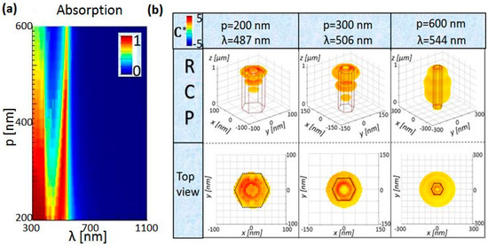 As the coupling between the neighboring NWs influences the electromagnetic fields, we further investigated the absorption and C* dependence on the periodicity (Figure 3a) for r = 50 nm and L = 1000 nm. 2D periodic NW arrays are photonic crystals, where, for larger periods, the single NW modes are not considerably influenced by the array coupling [29,35]. However, for denser Si NW arrays, we note a blue-shift of the resonance with the decreasing period; this arises from the destructive coupling between the neighboring NWs due to enhanced near-field evanescent wave interaction. Unfortunately, in Figure 3b, for p = 200 nm, this leads to C* confinement inside the NW, which is detrimental for the applications where the enantiomers surround the NW in the unit cell. The situation can be optimized by increasing the periodicity, which confines C* also around the NW (e.g., p = 300 nm in the middle of Figure 3b, or p = 400 nm in the second graph in Figure 2). Finally, sparse arrays of p = 600 nm have stronger C* enhancement over the high part of the volume, as it will be shown later. This is due to the strong electromagnetic field enhancement in the near-field medium close to the NW, for the fundamental leaky waveguide modes of the single NW.