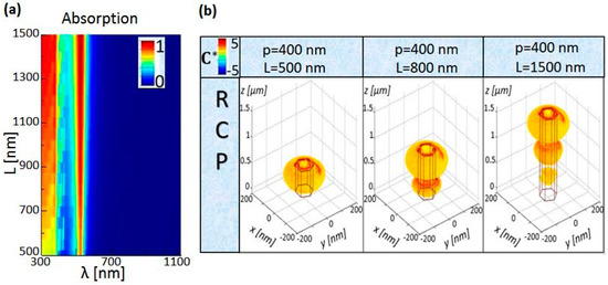 For the enhanced enantioselectivity, as previously discussed, the nanostructures can be optimized in order to interact with the enantiomers in the most efficient way, which depends also on the enantiomer position. Therefore, we investigated the NW length influence on C* distribution, for r = 50 nm and p = 400 nm. In Figure 4a, the modes do not shift with increasing length, but the unitary absorption is reached only for longer lengths. This is rather expected for vertical high refractive index nanowires, where the absorption peak arises due to the mode, which is mainly defined by the radial boundary conditions of the nanowire core (as in dielectric waveguides). Therefore, the radius plays a major role in the spectral position of the absorption peak, while other geometric parameters have a minor influence, as we experimentally demonstrated in [17,18,30,31]. As expected, the shortest NW (L = 500 nm) has an enhanced C* only due to the first antinode of the resonant mode, while for L = 800 nm another antinode appears. Finally, for L = 1500 nm, three enhanced volume parts are distinguishable; however, the bottom one would not contribute to the enantioselectivity as its C* is more confined inside the NW. If we consider e.g., the enantiomers with absorption dissymmetry around 525 nm, the best Si NW substrate (with r = 50 nm and p = 400 nm) would be the one with L = 500 nm, and the matrix with chiral molecules should be deposited between z = 0 nm and z = 500 nm. Otherwise, if the NW length is fixed to L = 1500 nm, in order to use zones with the highest C*, one should deposit another non-absorbing and achiral medium (buffer layer) in the range 0 nm < z < 1000 nm, and then the chiral substance in the range 1000 nm < z < 1500 nm, which complicates the simple approach proposed here.
