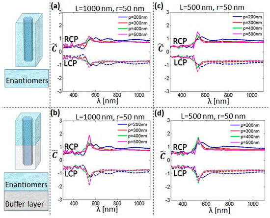 where we integrate C across the unit cell as follows: in the xy plane, only the parts of the unit-cell outside of the NW core are considered, while in the z direction, we investigate two possibilities. First, we integrate in the 0 < z < L range (upper sketch of Figure 5), i.e., total integration. Then, we take into account only the top C* antinode, integrating in the L/2 < z < L range (bottom sketch of Figure 5), i.e., half-integration, which corresponds to the case when the enantiomers are specially positioned on a buffer layer in order to experience higher C. We approximate that the buffer layer has negligible influence on the C* distribution, which is valid for low concentrations of chiral molecules, deposited in a solvent which subsequently evaporates. However, generally the buffer layer does change the modal confinement, and the NW array must be reoptimized in terms of r, L and p in order to give enhanced C* once the optical properties of the buffer layer are known. In Figure 5a, the total integration of L = 1000 nm and r = 50 nm, for the periodicities from 200 nm to 400 nm gives almost no enhancement at the resonant wavelengths, and it is vaguely present only for p = 500 nm (the lowest NW coupling, ). However, the half-integration in Figure 5b improves this difference; here, especially for p = 500 nm, reaches almost 2, which is a considerable average enhancement for a 0.5 × 0.5 µm2 surface. For shorter NWs, L = 500 nm and r = 50 nm, the total integration in Figure 5c gives improvement with respect to Figure 5a, due to inclusion of the part of the space where one antinode generates enhanced C* (Figure 4b-left). However, this case does not get improved with the half-integration, Figure 4d.