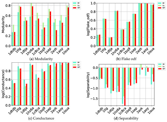 Figure 1a relates the comparison along modularity and shows that Louvain achieves higher modularity than the other methods on each of the 10 test cases; as related in Section 4, higher modularity relates to better community structure. As described in Section 4, a better partitioning method achieves lower flake odf and lower conductance. Figure 1b–d draw the logarithm (base 10) of these metrics. Louvain, InfoMap, and Walktrap perform comparably according to flake odf, whereas, on conductance, Louvain achieves lower values than the other methods. Louvain outperforms the other methods on separability. As related in Section 4, the separability metric is higher in well-defined communities with many edges inside but fewer edges pointing to the rest of the network. This comparison again points to Louvain as the top community detection method to identify community structure in decoy data embedded in a directed nngraph.