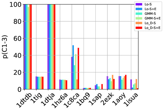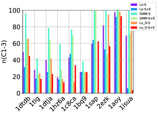 Based on the results related above, we now focus the remainder of our evaluation on the communities obtained with the Louvain method on undirected and directed graph embeddings of decoy data, as well as on communities obtained with the GMM method (on undirected graph embeddings). Out of the communities into which a decoy dataset is partitioned by a specific community detection method, we select a top few via four different selection strategies. These are described in detail in Section 4. In summary, the selection strategies leverage the size of a community (the number of decoys in it) and its energy (defined as either the minimum or average energy over the decoys in it) to sort communities and then select the top l from the obtained sorted order, with l varying in .