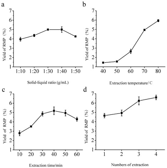 The effect of different extraction times (10, 20, 30, 40, 50, and 60 min) on the RMP yield was investigated, with the other extraction parameters fixed as follows: Solid–liquid ratio, 1:40; extraction temperature, 80 °C; number of extractions, one. As shown in Figure 1c, the RMP yield increased with increasing extraction time from 10 to 40 min, with RMP production approaching a maximum at 40 min (5.18%) and decreasing thereafter. This decrease indicated that longer extraction times led to thermal instability and degradation of the RMPs [17]. Consequently, 40 min was selected as the optimal RMP extraction times.