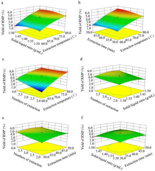 3D response surface plots showing the interaction effects on the RMP extraction yield: (a) Solid–liquid ratio and extraction temperature; (b) extraction time and extraction temperature; (c) number of extractions and extraction temperature; (d) number of extractions and solid–liquid ratio; (e) number of extractions and extraction time; and (f) and solid–liquid ratio and extraction time.