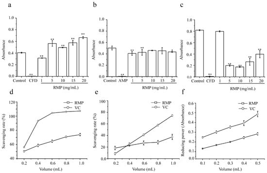 Antibacterial and antioxidant activity of RMPs. Effects of RMPs on the proliferation of (a) E. coli, (b) S. aureus, and (c) P. aeruginosa. (d) Hydroxyl radical scavenging activity; (e) superoxide-radical scavenging activity; and (f) reducing the power of RMPs. Values shown are means ± SD obtained from three measurements. Abbreviations: CFD, Cefobid; AMP, ampicillin; and VC, vitamin C. ** P < 0.01 and * P < 0.05.