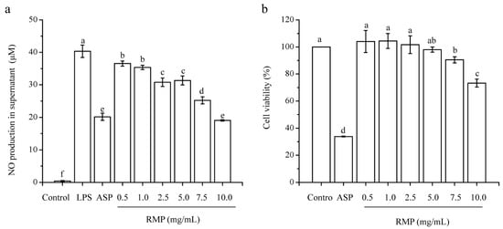 Anti-inflammatory activity of RMPs. (a) Effect of RMPs on inhibiting NO production and (b) the cell viability of RAW 264.7 cells. Abbreviations: LPS, lipopolysaccharides; ASP, aspirin. Different letters (a-f) indicate significant difference between groups (P < 0.05) and same letters indicate P > 0.05.