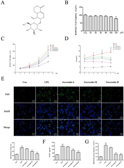 The effects of sweroside in LPS-induced RAW264.7 cells: (A) The chemical structure of sweroside. (B) The cytotoxicity assay was conducted to measure the viability of RAW264.7 cells with sweroside (10–320 µM) for 24 h. (C) The proliferation assay was conducted to measure the viability of sweroside (20, 40 and 80 μM) in LPS-induced RAW264.7 cells for 7 days. (D) The NO assay was detected with the treatment of sweroside (20, 40 and 80 μM) in LPS-induced RAW264.7 cells for 7 days. (E) The EdU assay was detected with the treatment of sweroside (20, 40 and 80 μM) in LPS-induced RAW264.7 cells for 5 days via a fluorescence microscope at 200×. The prostaglandin E2 (PGE2) (F) and reactive oxygen species (ROS) (G) assay was detected with the treatment of sweroside (20, 40 and 80 μM) in LPS-induced RAW264.7 cells for 5 days. The results were expressed as mean ± SD (n = 3), # p < 0.05, ## p < 0.01 compared with the Con group; * p < 0.05, ** p < 0.01 compared with the LPS group.