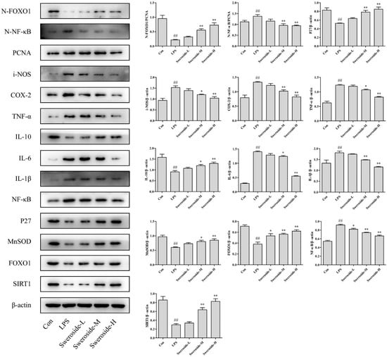 The Western blot analysis for sweroside in LPS-induced RAW264.7 cells: SIRT1, NF-κB, FOXO1, N-NF-κB, N-FOXO1, i-NOS, COX-2, IL-1β, IL-6, IL-10, TNF-α, MnSOD and P27 were detected with the treatment of sweroside (20, 40 and 80 μM) in LPS-induced RAW264.7 cells for 5 days. # p < 0.05, ## p < 0.01 compared with the Con group; * p < 0.05, ** p < 0.01 compared with the LPS group.