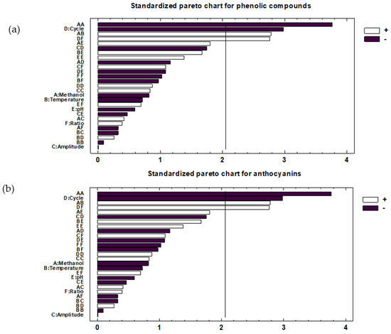 Pareto charts of the standardized effects: (a) Total phenolic compounds and (b) total anthocyanins.