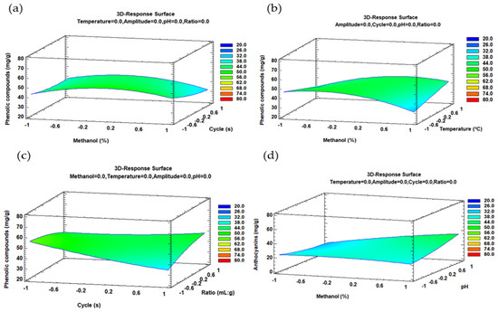 3D-surface plots of the Box–Behnken design to represent the influence of: (a) Solvent composition and cycle on the total phenolic compounds; (b) solvent composition-temperature on the total phenolic compounds; (c) cycle-ratio on the total phenolic compounds; (d) solvent composition-pH on the total anthocyanins.