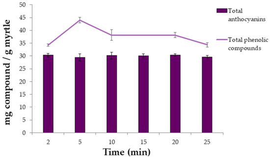 Recovery of anthocyanins (mg·g−1) and total phenolic compounds (mg·g−1) using different extraction times (n = 3).