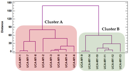 As a consequence of the chemical results obtained, it can be observed that there are differences between the average values obtained from the different myrtle ecotypes. To objectively study if these visual differences are related to the origin of the ecotypes, a comparative chemometric study was carried out using all the average values. Specifically, the data matrix D13 × 14 (Dvariables × ecotypes) (Table 4) was evaluated using an exploratory tool, i.e., Hierarchical Cluster Analysis (HCA). Ward’s method and square Euclidean distance were employed and the variables for the differentiation were: The total phenolic compounds (mg·g−1) from each experiment; each individual anthocyanin content, 11 anthocyanins (mg·g−1), and total anthocyanins (mg·g−1). Myrtle is a shrub that grows better in warm and humid areas, and requires rich, humid soils. These characteristics match those of Puerto Real, which is near the sea with humid and sandy soils. San José del Valle has drier climate conditions and its clay soil is not so fertile [46,47]. These differences may lead to differences between the maturation processes of the autochthonous ecotypes in Puerto Real and San José del Valle, and consequently, to variations in their bioactive composition. The results of the analysis are graphically represented as a dendrogram in Figure 4. An obvious differentiation of the samples into two groups can be observed: Cluster A, includes only the ecotypes from Puerto Real, and Cluster B, only includes the ecotypes from San José del Valle. Therefore, based on their tendency to fall into a particular group in accordance with their origin, it can be said that phenolic compounds and anthocyanins contents in each ecotype is related to the berries’ geographical area of origin. Specifically, the ecotypes in Cluster A, Puerto Real, present a total phenolic compounds and anthocyanins content greater than the ecotypes in Cluster B, from San José del Valle. The differences can be attributed to the different climatic and soil conditions above mentioned.