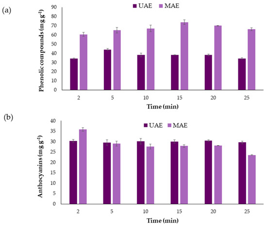 Once the effects of the variables on the extraction methods and the optimal values were known, the kinetics of the extractions was studied. Several extractions were carried out under optimal ultrasound conditions while extraction time varied between 2, 5, 10, 15, 20, and 25 min. The average results obtained (n = 3) for phenolic compounds and for anthocyanins are represented in Figure 3.