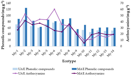 Additionally, both techniques were applied to different myrtle ecotypes (Figure 6). As above noted, MAE stands out as a more efficient method for the extraction of the phenolic compounds in myrtle berries. With respect to anthocyanins, although some particular ecotypes produced greater yields by MAE, most of them produced greater yields when UAE was employed. Anthocyanins are extremely susceptible to degradation and the combination of high pressure and temperature that is employed for MAE would enhance such degradation and affect negatively their recovery.