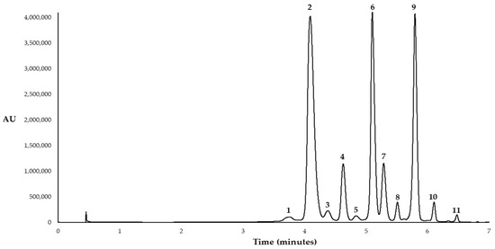 Chromatogram of the 11 anthocyanins identified in the UAE extracts from myrtle berries. Peak assignment: (1) Delphinidin 3,5-O-diglucoside; (2) delphinidin 3-O-glucoside; (3) cyanidin 3-O-galactoside; (4) cyanidin 3-O-glucoside; (5) cyanidin 3-O-arabinoside; (6) petunidin 3-O-glucoside; (7) delphinidin 3-O-arabinoside; (8) peonidin 3-O-glucoside; (9) malvidin 3-O-glucoside; (10) petunidin 3-O-arabinoside; (11) malvidin 3-O-arabinoside.