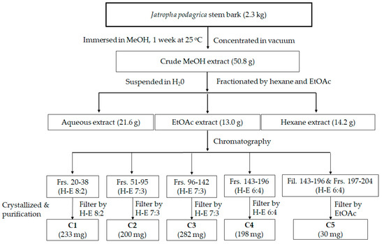 Separation of bioactive compounds from J. podagrica was conducted following the procedure illustrated in Figure 1. The methanol extract of this plant (50.8 g) was extracted with hexane, ethyl acetate, and water to produce 14.2, 13.0, and 21.6 extracts, respectively. The ethyl acetate extract was then separated by column chromatography using a gradient elution technique as follows: Fractions (Frs.) 20–38 (hexane: EtOAc = 8:2), Frs. 51–95 (hexane: EtOAc = 7:3), Frs. 96–142 (hexane: EtOAc = 7:3), Frs. 143–196 (hexane: EtOAc = 6:4) to obtain 223 mg (C1), 200 mg (C2), 282 mg (C3), and 228 mg (C4) of compounds. C5 (30 mg) was the mixture Frs. 197–204 and residue of Frs. 143–196 after filtration by EtOAc.