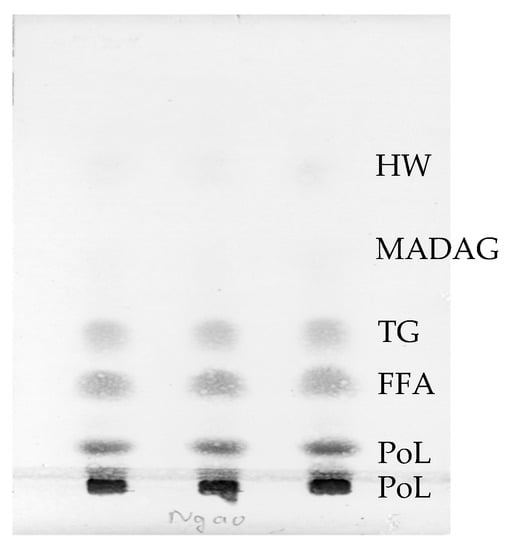 To determine lipid class compositions, the extracted lipids were first dissolved in chloroform (10 mg/mL) and then spotted onto the one-dimensional thin-layer chromatography (TLC) using the pre-coated silica gel plates (6 cm × 6 cm) Sorbfil PTLC-AF-V (Sorbfil, Krasnodar, Russia). The first development of the plate was carried out with n-hexane/diethyl ether/acetic acid (85:15:1, v/v/v) for full length. Then, the plate was redeveloped with CHCl3/CH3OH (2:1, v/v) for 5% length. Subsequently, the plates were air-dried, sprayed with 10% H2SO4/CH3OH and heated at 240 °C for 10 min. An image scanner (Epson Perfection 2400 Photo, Epson, Suwa, Japan) operating in grayscale mode was employed to obtain chromatograms. For determination of lipid percentages, band intensity was evaluated using an image analysis program (Sorbfil TLC Video densitometer, Krasnodar, Russia).