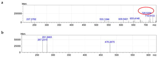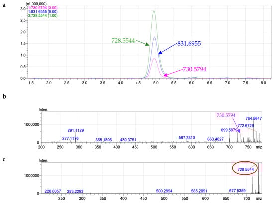 PlsEtn can be characterized according to their MS and MS/MS data. The signals of positive quasi-molecular ions [M + H]+, cluster ions [M + H + C6H15N]+ and negative quasi-molecular ions [M − H]− were observed in the HRMS spectra of all components of formula species of PE. For instance, we detected signals of negative quasi-molecular ions [M − H]− at m/z 728.5544 ([C41H79NO7P]−, calculated 728.5594, different 0.00556), positive quasi-molecular ions [M + H]+ at m/z 730.5794 ([C41H81NO7P]+, calculated 730.5751, different 0.00488), and positive cluster ions [M + C6H15N]+ at m/z 831.6822 ([C47H96N2O7P]+, calculated 831.6955, different 0.01277) of PE 36:1 (Figure 2).