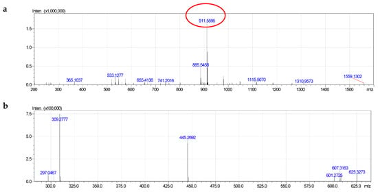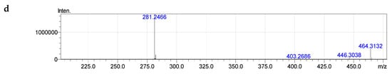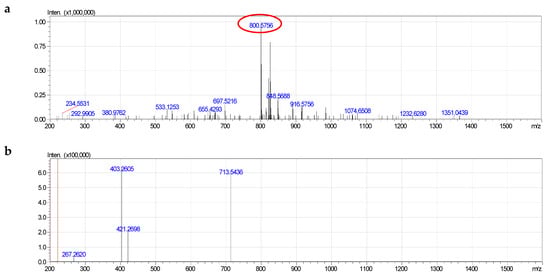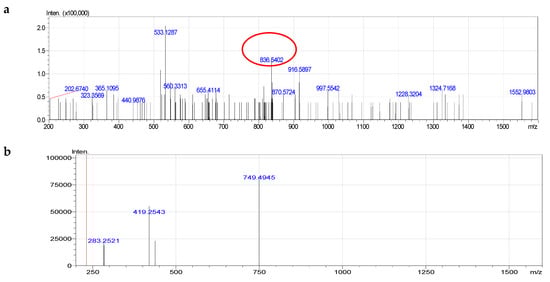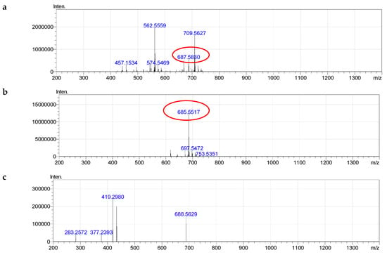 For example, we had signals of negative quasi-molecular ions [M − H]−, at m/z 685.5565 ([C39H78N2O5P]−, calculated 685.5648, different 0.00888), positive quasi-molecular ions [M + H]+ at m/z 687.5830 ([C39H80N2O5P]+, calculated 687.5805, different 0.00306), and positive adductions [M + Na]+ at m/z 709.5627 ([C39H79N2O5NaP]+, calculated 709.5619, different 0.00082) of CAEP 37:1 (Figure 9).