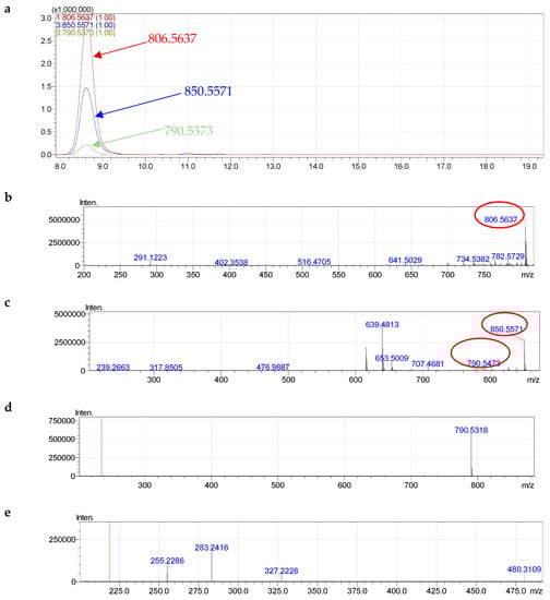 Fragmentation of PC (38:6): a—HPLC-HRMS, b—MS+; c—MS− of fragmentation 850.5490 and 790.5301; d, e—MS2− of fragmentation 850.5490 and 790.5301.