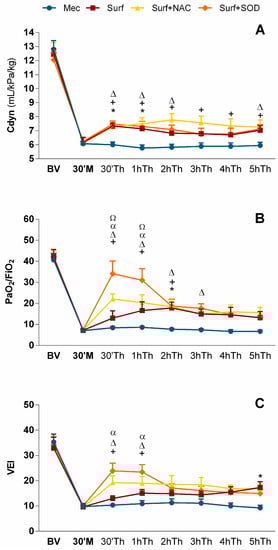(A) Lung compliance (Cdyn), (B) PaO2/FiO2 and (C) Ventilation efficiency index (VEI) before meconium administration (BV), 30 min (30′) after meconium (M) and therapy (Th) administration during 5 h (h) of experiment. Mec—untreated meconium group; Surf—surfactant-only treated group; Surf + NAC—surfactant and NAC-treated group; Surf + SOD—surfactant and SOD-treated group; * p = 0.041 to 0.018 for Surf vs. Mec; + p = 0.038 to 0.0004 for Surf + NAC vs. Mec; Δ p = 0.041 to 0.0001 for Surf + SOD vs. Mec; α p = 0.027 to 0.0001 for Surf + SOD vs. Surf; Ω p = 0.007 to 0.002 for Surf + SOD vs. Surf + NAC. Part of the results reproduced with permission from [].