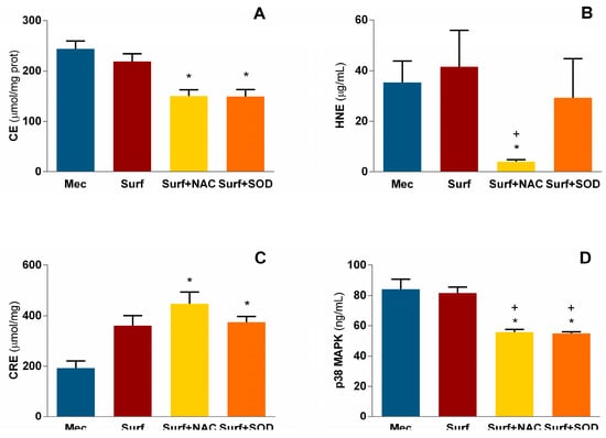 Levels of (A) advanced oxidation protein products, (B) hydroxynonenal (HNE), (C) total antioxidant capacity and (D) p38 mitogen-activated protein kinase (p38 MAPK) in pulmonary tissue homogenates. Mec—untreated meconium group; Surf—surfactant-only treated group; Surf + NAC—surfactant and NAC-treated group; Surf + SOD—surfactant and SOD-treated group; CE—chloramine equivalents; CRE—copper reducing equivalents; * p = 0.001 to 0.042 vs. Mec; + p = 0.015 to 0.046 vs. Surf.