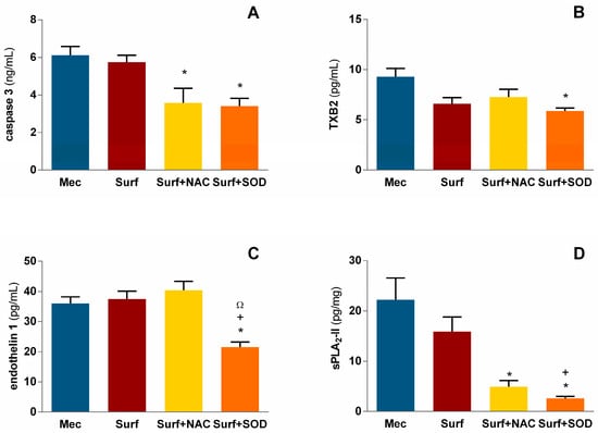 Levels of (A) caspase 3, (B) thromboxane B2 (TXB2), (C) endothelin 1 and (D) secretory phospholipase A2 type II (sPLA2-II) in pulmonary tissue homogenates; Mec—untreated meconium group; Surf—surfactant-only treated group; Surf + NAC—surfactant and NAC-treated group; Surf + SOD—surfactant and SOD-treated group; * p = 0.009 to 0.046 vs. Mec; + p = 0.011 to 0.013 vs. Surf; Ω p = 0.002 vs. Surf + NAC.