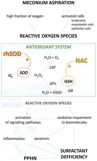 Brief insight into mechanisms induced by reactive oxygen species (ROS) after meconium aspiration. High fraction of oxygen during ventilation and meconium-activated cells contribute to ROS production. Antioxidant system eliminates harmful radicals. Excessive ROS impair biomolecules and trigger pathways leading to inflammatory and apoptotic processes. As a result, surfactant dysfunction and persistent pulmonary hypertension of newborn (PPHN) can be seen. Administration of either recombinant human superoxide dismutase (rhSOD) or N-acetylcysteine (NAC) could increase antioxidant capacity and affect subsequent alterations. SOD—superoxide dismutase; CAT—catalase, GPx—glutathione peroxidase, GR—glutathione reductase, GSH—reduced glutathione; GSSG—oxidized glutathione.