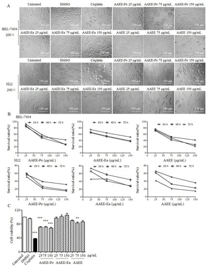 The effect of A. absinthium ethanol extract (AAEE) and its petroleum ether (AAEE-Pe) and ethyl acetate (AAEE-Ea) subfractions on the growth of BEL-7404, H22, and NCTC1469 cells. Cells were treated with different concentrations of AAEE, AAEE-Pe, and AAEE-Ea. (A) After 24 h, the morphology of BEL-7404 and H22 cells was observed by inverted microscope. (B) After 24, 48, and 72 h, the viability of BEL-7404 and H22 cells was detected by MTT assay. (C) After 24 h, the viability of NCTC1469 cells was detected by MTT assay. ** p < 0.01, *** p < 0.001 compared to Untreated.