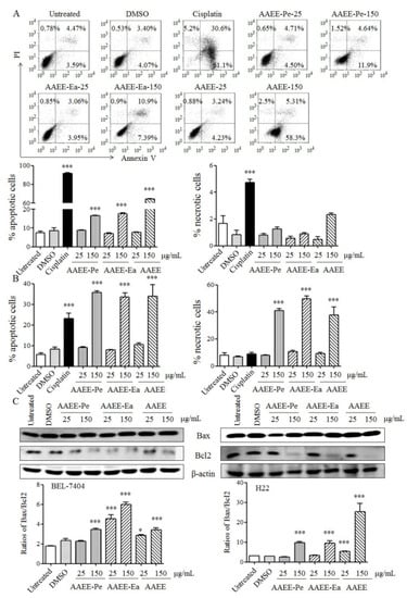 AAEE, AAEE-Pe, and AAEE-Ea induced apoptosis in BEL-7404 and H22 cells. Cells were treated with different concentrations of AAEE, AAEE-Pe, and AAEE-Ea for 24 h. After staining with Annexin V and PI, BEL-7404 (A) and H22 (B) cells were analyzed by flow cytometry. (C) Proteins were isolated, and the levels of Bax and Bcl-2 were analyzed by Western blot. * p < 0.05; *** p < 0.001 compared to Untreated.