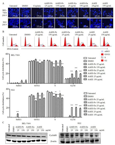 AAEE, AAEE-Pe, and AAEE-Ea induced cell cycle arrest in BEL-7404 and H22 cells. BEL-7404 and H22 cells were treated with different concentrations of AAEE, AAEE-Pe, and AAEE-Ea for 24 h. (A) BEL-7404 and H22 cells were stained with Hoechst 33258 and observed by inverted fluorescence microscope. (B) DNA contents in BEL-7404 cells were analyzed by flow cytometry and are shown in the upper panels. The summaries of the cell cycle distributions in BEL-7404 and H22 cells are shown in the middle and bottom panels, respectively. (C) Expression of Cyclin B1 was analyzed by Western blot. * p < 0.05; ** p < 0.01; *** p < 0.001 compared to Untreated.