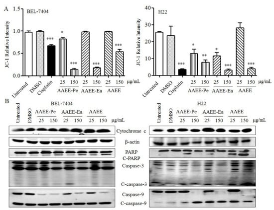 The mitochondria-dependent apoptosis induced by AAEE, AAEE-Pe, and AAEE-Ea. BEL-7404 and H22 cells were treated with different concentrations of AAEE, AAEE-Pe and AAEE-Ea for 24 h. (A) Cells were stained with JC-1 dye and analyzed by flow cytometry. (B) Total protein was isolated to detect the release of cytochrome c and the levels of poly(ADP-ribose) polymerase (PARP), cleaved-PARP (C-PARP), cleaved-caspase-3, caspase-3, cleaved-caspase-9, and caspase-9 by Western blot. * p < 0.05; ** p < 0.01; *** p < 0.001 compared to Untreated.