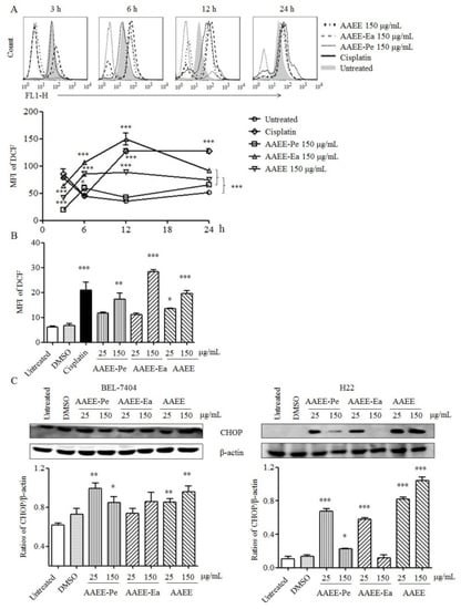 AAEE, AAEE-Pe, and AAEE-Ea induced ROS generation and ER stress. (A) BEL-7404 cells were treated with 150 μg/mL of AAEE, AAEE-Pe, and AAEE-Ea and the levels of ROS were analyzed by flow cytometry at indicated time points. (B) H22 cells were treated with different concentrations of AAEE, AAEE-Pe, and AAEE-Ea for 24 h and the levels of ROS were analyzed by flow cytometry. (C) BEL-7404 and H22 cells were treated with different concentrations of AAEE, AAEE-Pe, and AAEE-Ea for 24 h. Cell lysates were used to analyze the levels of CHOP by Western blot. * p < 0.05; ** p < 0.01; *** p < 0.001 compared to Untreated.