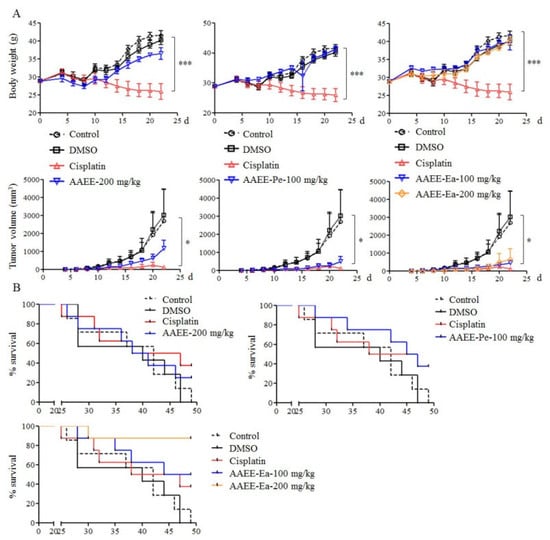 AAEE, AAEE-Pe, and AAEE-Ea suppressed tumor growth in vivo. A tumor mouse model was established by injection of H22 cells. After 3 days, tumor mice were treated with DMSO, cisplatin, AAEE, AAEE-Pe, and AAEE-Ea. Body weight of mice, tumor sizes (A), and survival rates (B) were monitored at the indicated time points. * p < 0.05; *** p < 0.001 compared to control.