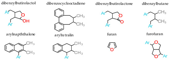- Solyomvary, A.; Beni, S.; Boldizsar, I. Dibenzylbutyrolactone Lignans-A Review of Their Structural Diversity, Biosynthesis, Occurrence, Identification, Importance. Mini Rev. Med. Chem. 2017, 17, 1053–1074. [Google Scholar] [CrossRef] [PubMed]