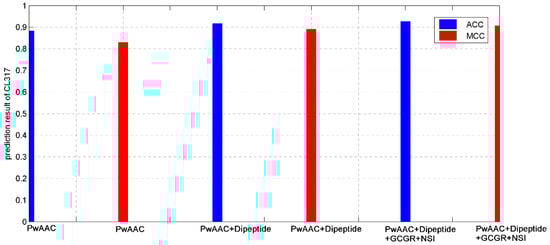As Figure 1 depicts, the model combined all features achieved much higher prediction accuracy than others, indicating that: (1) feature fusion techniques are promising to improve the prediction accuracy since single-view feature can only reflect part of the information of a protein sequence; (2) the two features GCGR and NSI can be served as a helpful complementary to features like PwAAC and Dipeptide, revealing the effectiveness of the two novel feature representation techniques as well.