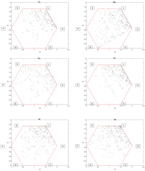 Firstly, we drew a regular hexagon, in which each vertex is associated with a distinct label of H, L, S, P, G and C, and each edge is of unit length. Then, for each encoded primary sequence in the first step, we plotted its letters sequentially as vertices inside the hexagon as follows: the first vertex, corresponding to the first letter of the primary sequence, was placed in the center of the hexagon; and the i-th vertex, corresponding to the i-th letter, was placed in the middle of the first (i-1)-th vertices and the vertex representing the i-th letter in the hexagon. After that, a plot named the GCGR of the primary sequence was drawn. As examples, we plotted in Figure 2 the GCGRs for six representative proteins with each belonging to a different subcellular location. From the six GCGR figures, we can directly retrieve some valuable information: for proteins in the Cy and Nu classes, the plotted points are close to vertices H and L; the protein in the Me class are uniformly distributed around all the vertices except for C; proteins in the Nu and En classes have fewer points around vertices G, C and P, G, respectively; proteins in the last two classes are almost uniformly distributed. In a word, the proteins in different subcellular locations distributed differently in the GCGR plots.