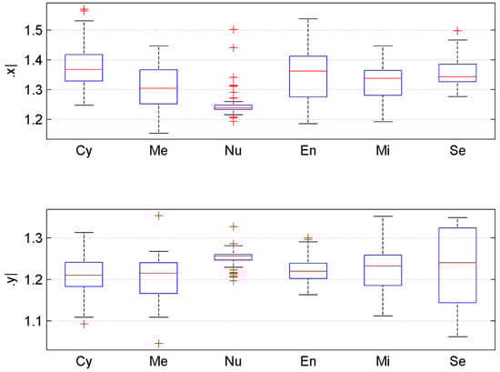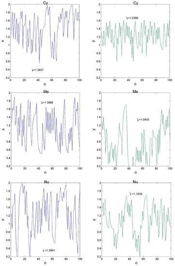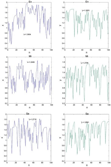 As can be seen from Figure 2, each letter in the protein sequence corresponds to a (x, y)-coordinate in the GCGR plot. We then modelled the GCGR plot as a combination of two series: one is composed of the x-coordinates and the other is composed of the y-coordinates, which were named x-series and y-series, respectively. As can be seen from Figure 3 and Figure 4, there are many useful observations: (1) The average values of the x-series and y-series for proteins in the En-class, denoted as and respectively, tend to be greater than those for proteins in the other classes; (2) Proteins in the first class Cy also have a large , but do not have a large ; (3) Proteins in the last two classes Mi and Se have moderate and , respectively.