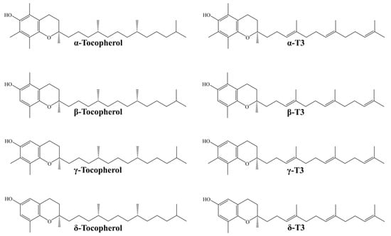The chemical structure of four tocopherol and tocotrienol isoforms.