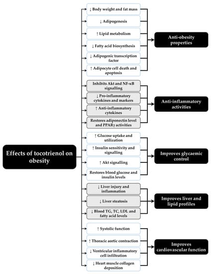Obesity is closely associated with low-grade inflammation, which subsequently increases the risk of cardiovascular diseases, metabolic syndrome, insulin resistance, and diabetes mellitus [42]. Anti-inflammatory properties of T3 were reported in several cell lines and obesity animal models [33,34,35,40,43,44]. T3 in RBEE (5%) [34], muscadine grape seed oil (MGSO) [33], TRF from MGSO [33], annatto oil T3 mixture [40], and γ-T3 [35,41,44] were reported to suppress the release and expression of pro-inflammatory mediators including TNF-α, granulocyte colony-stimulating factor (G-CSF), C/EBPβ, leptin hormone, interleukin-1β (IL-1β), interleukin-6 (IL-6), interleukin-8 (IL-8), inducible nitrite oxide synthase (iNOS), and/or monocyte chemotactic protein-1 (MCP-1). Lower concentrations of γ-T3 (0.024-2.4µM) also resulted in partial suppression of TNF-α-upregulated MCP-1 and IL-6 expression with the restoration of adiponectin and PPARγ expression in differentiated 3T3-L1 cells [41]. Besides, annatto oil T3 mixture was also reported to upregulate anti-inflammatory cytokine interleukin 10 (IL-10) mRNA levels in the adipose tissue of high-fat diet-fed C57BL/6J mice [40]. In addition, annatto oil T3 mixture [40] and γ-T3 (0.05% diet) [35] also significantly reduced macrophage infiltration in the adipose tissue of obese mice.