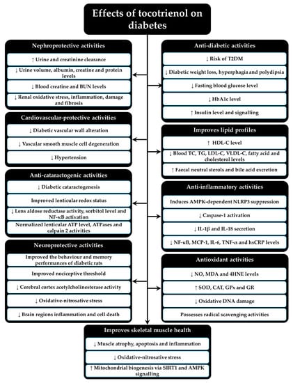 The beneficial effects of tocotrienol on diabetes from preclinical and clinical studies. Abbreviations: ↑ = increase or upregulate, ↓ = decrease or downregulate, AMPK = 5′-adenosine monophosphate-activated protein kinase, BUN = blood urea nitrogen, CAT = catalase, GPx = glutathione peroxidase, GR = glutathione reductase, HbA1c = glycated hemoglobin, HDL-C = high-density lipoprotein, hsCRP= high sensitivity-C reactive protein, 4HNE = 4-hydroxynonenal, IL-1β= interleukin 1β, IL-6= interleukin 6, IL-18= interleukin 18, LDL-C = low-density lipoprotein, MCP-1= monocyte chemotactic protein-1, MDA= malondialdehyde, NF-κB = nuclear factor-κB, NLRP3= nucleotide-binding oligomerization domain-like receptor protein 3, NO = nitric oxide, SIRT1= sirtuin 1, SOD= superoxide dismutase, T2DM= type 2 diabetes mellitus, TC = total cholesterol, TG = triglyceride, TNF-α= tumor necrosis factor-α, VLDL-C = very low-density lipoprotein cholesterol.
