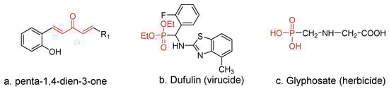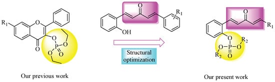 Phosphonates and their immediate derivatives possess a wide range of biological activities [19,20,21,22,23,24,25] and are, therefore, widely employed as plant virucides (Figure 1b), bactericides, fungicides, herbicides (Figure 1c), and plant growth regulators. Because the phosphorus–carbon bond of phosphonate derivatives is not susceptible to enzymatic degradation, they possess improved cell permeability, a lipophilic nature, and good physiological stability [26,27]. In a previous study from our group, we synthesized a series of phosphorylated flavonoid derivatives (Figure 2), most of which exhibited excellent antibacterial activities [21,28]. However, relatively few reports were conducted on plant antiviral activities. Therefore, phosphonate attracted considerate attention in the field of pesticide application.