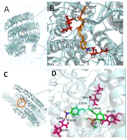 To identify the 3h and 3j recognition sites in TMV CP (Protein Data Bank (PDB) code: 1EI7), we performed molecular docking using the Gold method with 200 cycles [35,36,37]. As depicted in Figure 4, the two compounds were well embedded in the activity pocket (ARG-46, GLN-34, ARG-90, etc.) between the two subunits of TMV CP. Among them, ARG-46 had a strong hydrogen bond with 3h (2.022 Å), and NO2 (3h) demonstrated three hydrogen bonds with GLN-34 (O–H = 1.990 Å, 2.042 Å, and 2.045 Å). Moreover, ARG-46 showed two hydrogen bonds with 3j (1.848 Å, 2.063 Å), and phosphate demonstrated a strong hydrogen bond with ARG-90 (O–H = 1.927 Å). There were also two hydrogen bonds between the NO2 and the residue ARG-90 (O–H = 2.557 Å, 1.942 Å). From the structural analysis, we can find that, when the benzene ring contained NO2, the corresponding compounds had better antiviral activity (protective), potentially due to the O on the NO2 forming hydrogen bonds (O–H) with GLN-34 and ARG-90, and potentially enhancing the interaction between the small molecules and TMV CP. These analyses indicated that novel phosphorylated penta-1,4-dien-3-one derivatives may be a potential lead structure for developing novel anti-TMV agents.