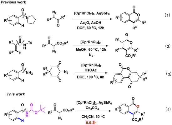 - Li, X.G.; Sun, M.; Liu, K.; Jin, Q.; Liu, P.N. Rh(iii)-catalyzed C-H activation/cyclization of benzamides and diazo compounds to form isocoumarins and α-pyrones. Chem. Commun. (Camb). 2015, 51, 2380–2383. [Google Scholar] [CrossRef] [PubMed]