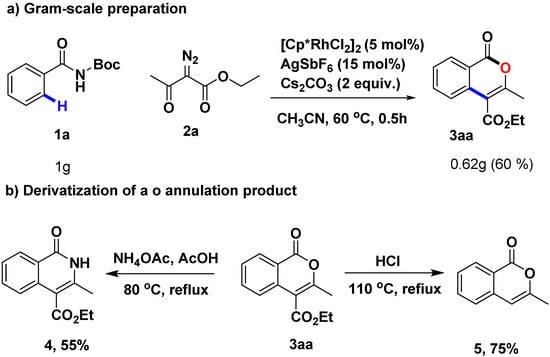 Gram-scale reaction (a) and derivatization (b) of the annulation product.